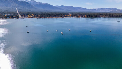 Aerial view of tranquil waters dotted with boats reflecting the clear sky, framed by a lush treeline against snow-capped mountains, Lake Tahoe, California, United States.