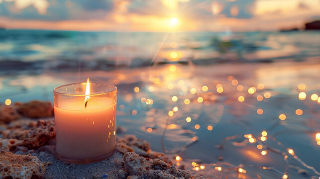 Minimalist cream pillar candle glowing on peach-gold bokeh backdrop for calm atmosphere