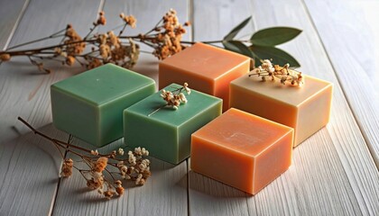 Minimalist arrangement of pastel mint green and peach scented soaps with natural dye