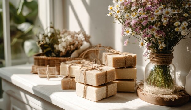 Handmade artisan soaps with dried herbs and flowers on a rustic wooden background