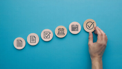 Hand placing a wooden circle with a checkmark icon onto a line of icons representing tasks and planning