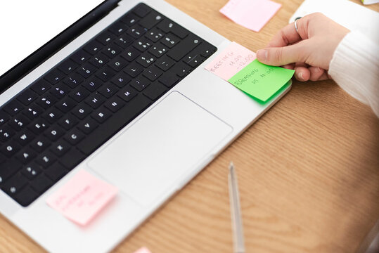 Coffee cup with sticky notes on wooden table for productivity concepts