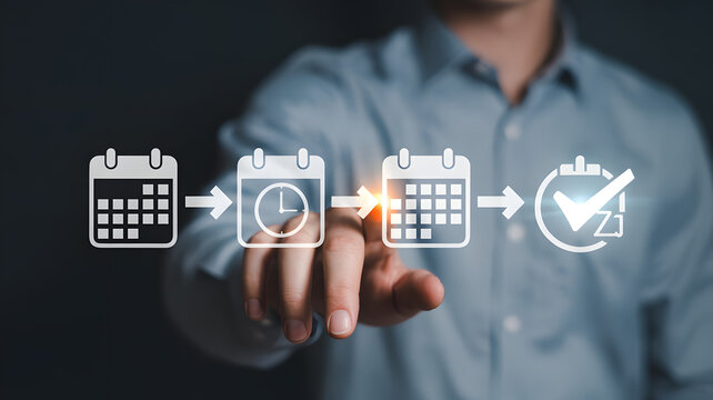 Planning and time management concept showing a sequence of calendar icons from scheduling to successful completion..png