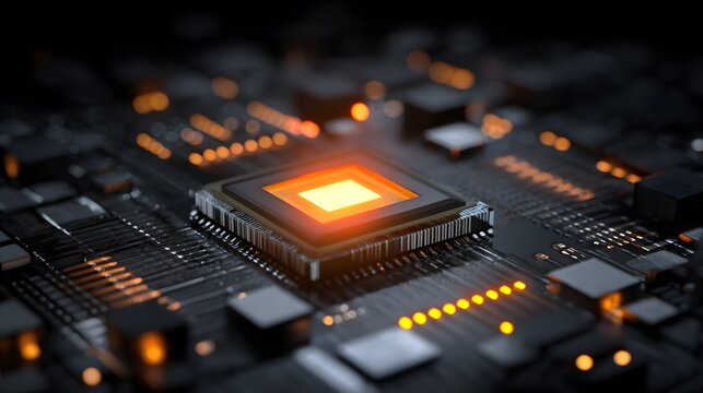 Innovative IT and technology concept of a central processor unit on a circuit board with glowing lines, representing digital data flow and advanced computing