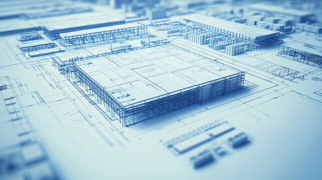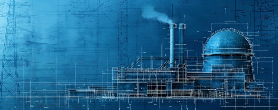 An intricate blueprint design of an industrial nuclear reactor overlaid on a blue technical background