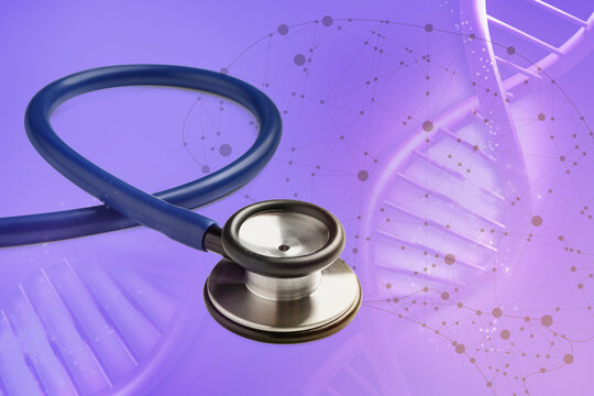 Stethoscope on violet background with scheme and illustration of DNA