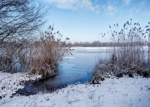 blick auf einen see im winter mit eis und schnee in schleswig holstein bei schönem wetter im naturpark lauenburgische seen, ort güster