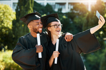 Selfie, university and friends with graduation students posing for a photograph on campus with certificate or diploma. Education, graduate and scholarship with a man and woman friend taking a picture