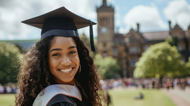 Smiling graduate in cap and gown with historic university building in background, celebrating graduation day achievement.