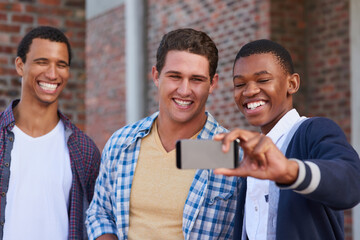 Smile, people and students with selfie outdoor for photography, social media post and education. Happy, men and friends for profile picture update, study group and scholarship for learning at college