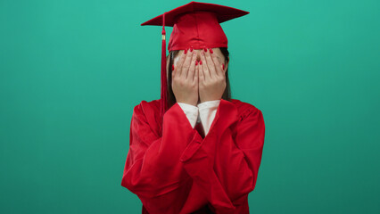 Excited graduate woman in cap indoors celebrating success, educational achievement concept