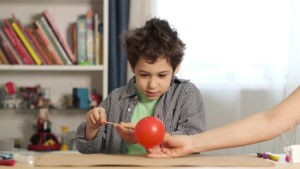 boy conducts an experiment pierces a balloon with a needle. Dangerous experiment. Home activities for children.
