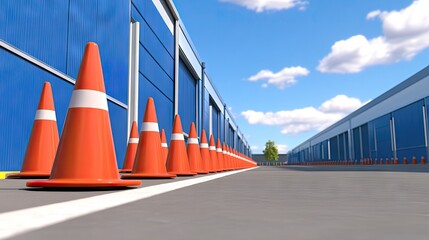 A row of traffic cones marking the driving school practice area on a sunny day with clear blue skies and modern storage buildings nearby