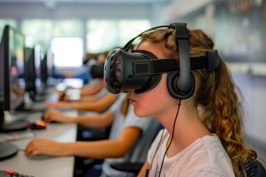Young schoolgirl exploring virtual reality in classroom setting