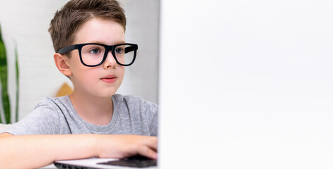 Child boy assembling in robotics class in the classroom. Concentrated focused boy in glasses having fun in workshop. Inventive kid enjoying science lesson at school
