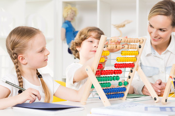 Cheerful schoolboy learning mathematics with abacus in classroom
