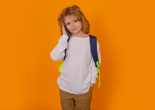 Schoolboy Using Smartphone And Backpacking For Learning Images
