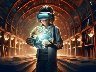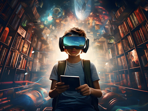 A boy using VR headset simulators for studying. Child is wearing virtual reality glasses sitting at desk with tablet in a library. Future learning concept