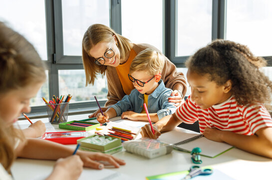 Diverse children focused in classroom setting with mentor overseeing