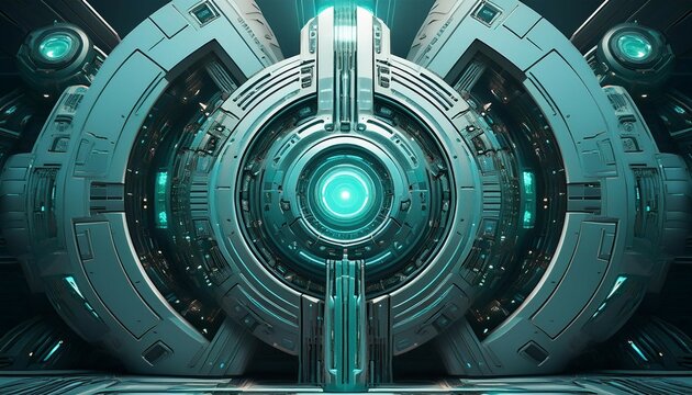 Futuristic glowing blue tech portal interface with circular digital elements and sci-fi energy core