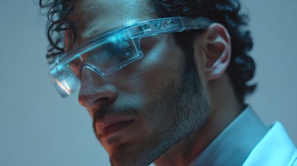 Man wears futuristic transparent glasses displaying glowing blue digital interface.