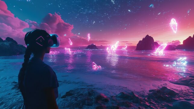 Woman wearing futuristic vr visor displaying galaxy nebula sci-fi beauty tech portrait
