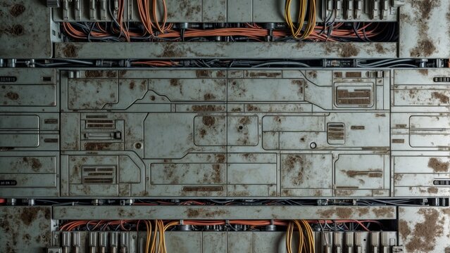 A close-up view of a weathered metal panel with numerous wires and connectors
