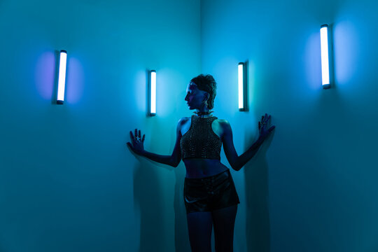 Cyberpunk woman in neon-lit futuristic setting