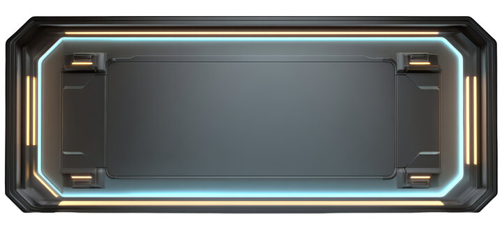 A Futuristic Metal Frame with Glowing Cyan and Orange Neon Lights and a Blank Central Panel for Text or Content on a Transparent Background.