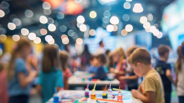 Defocused scene of a crowded science fair with kids ed around tables and eagerly asking questions.