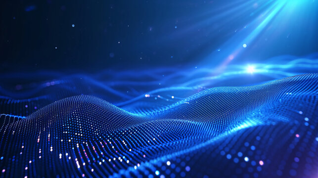 Futuristic blue digital waves flowing across a virtual landscape, representing artificial intelligence, data analysis, and modern technology innovations.