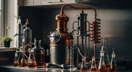 Spooky laboratory experiment bench with bubbling beakers colorful liquids glass tubing