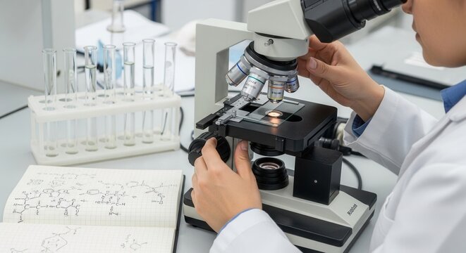 Person in lab coat using a microscope with test tubes and chemical structures on a notebook in a laboratory setting