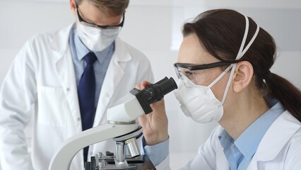 Scientists in laboratory analyzing test tubes wearing protective gear