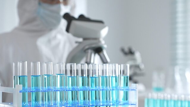 Medical scientist wearing protective suit using microscope while analyzing samples, conducting research in laboratory environment. Close up of test tubes with blue liquid