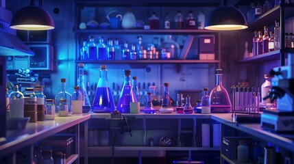 Laboratory glassware with colorful chemical liquid for scientific research, chemistry experiment in progress, science and technology concept background