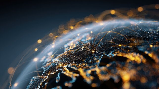 Digital globe with network of lights and connected trade routes representing globalization and connectivity
