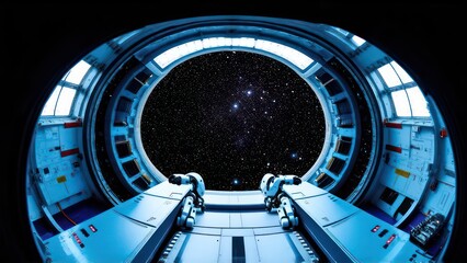 A  fish-eye panorama of a futuristic robot navigating space, reflecting the high-tech equipment and distant stars