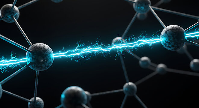 Abstract molecular structure with a glowing blue electrical discharge, symbolizing energy transfer, chemical bonding, or a powerful scientific breakthrough.