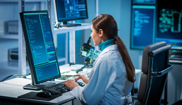 Workplace of young woman in modern microelectronics manufacturing lab. Engineer works in a modern scientific laboratory on computing systems and microprocessors.