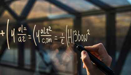 Hand writing scientific formula on glass surface, educational concept, math, physics, equations, science, research, learning, knowledge.