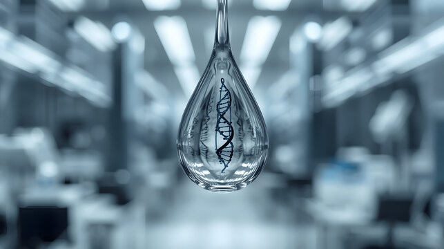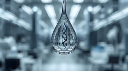 Transparent liquid droplet with dna helix inside futuristic laboratory symbolizing biotechnology genetics and scientific innovation concept