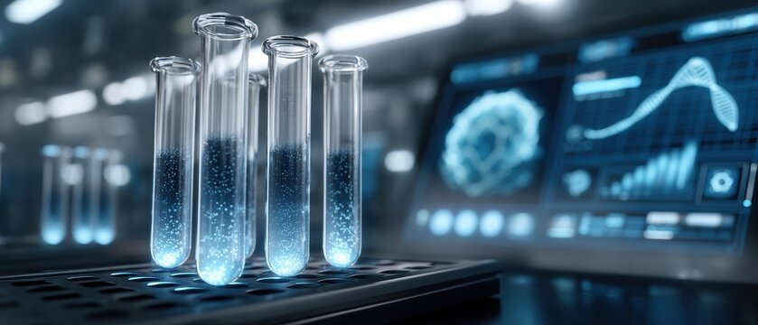 Test tubes with blue liquid are arranged in a high-tech laboratory, with digital data and scientific graphs displayed on advanced computer screens in the background.