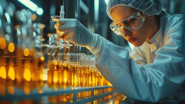 A focused scientist wearing protective gear meticulously conducts research in a laboratory, surrounded by test tubes and scientific equipment, emphasizing innovation and discovery.