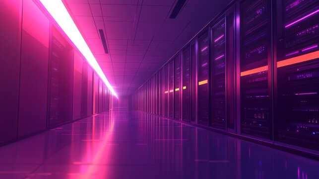 Futuristic Data Center Corridor with Neon Lighting and Server Racks, Reflective Floor in an Advanced Technology Environment, Ideal for Digital and IT Concepts