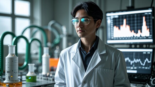 Asian scientist in lab coat in a laboratory environment with scientific equipment and computer monitors