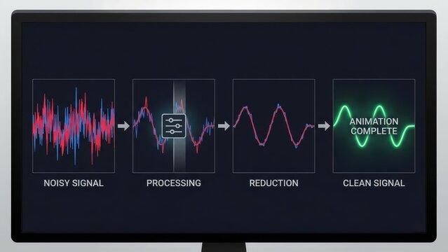 Digital display illustrating the conceptual process of signal processing, transforming a noisy data waveform through reduction steps to achieve a clean and clear output signal