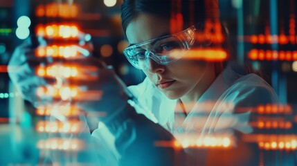 Scientist conducting an experiment in a laboratory with data visualization overlay. Focused research and scientific analysis.