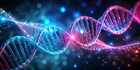 Ethereal Double Helix DNA Strand in Vibrant Blue and Pink, Scientific Wonder and Discovery Concept, Microscopic Cell-Like Background, Detailed 3D Render, Genetic Research