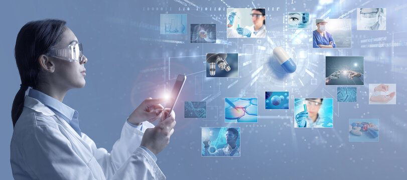 Smartphone Medical technology, doctor use AI robots for diagnosis, care, increasing accuracy patient treatment Medical research development innovation technology to improve patient health.